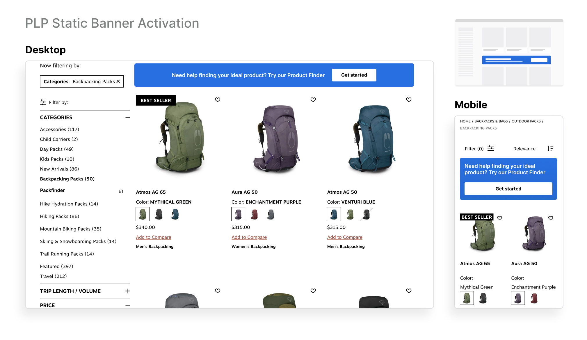 You can emphasize your product advisor through a static banner activation, targeting users who are engaging with a product listing page (PLP). This approach helps remind users of the advisor while they explore relevant product categories. Contact your Account Manager for assistance in setting up this activation.