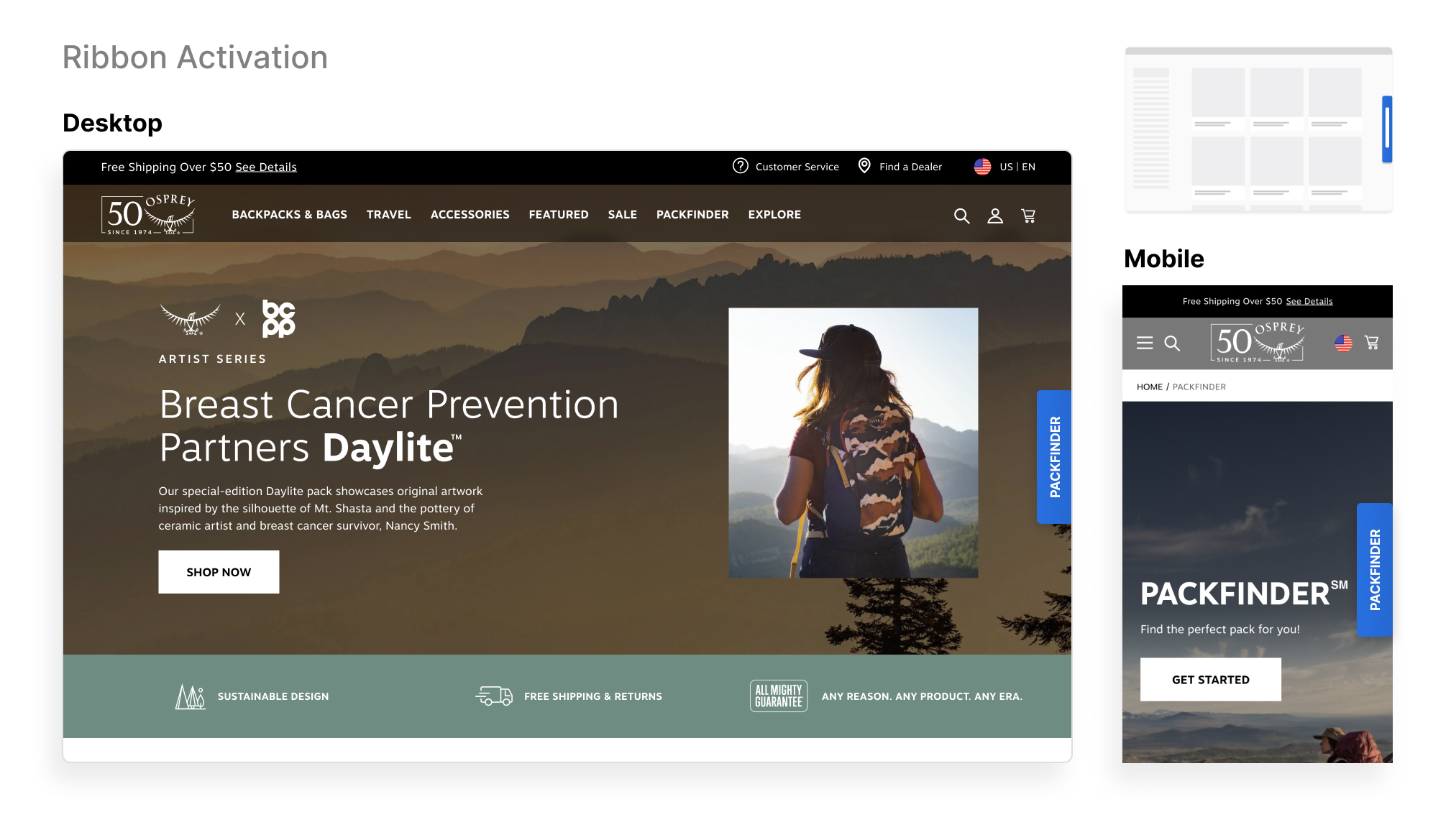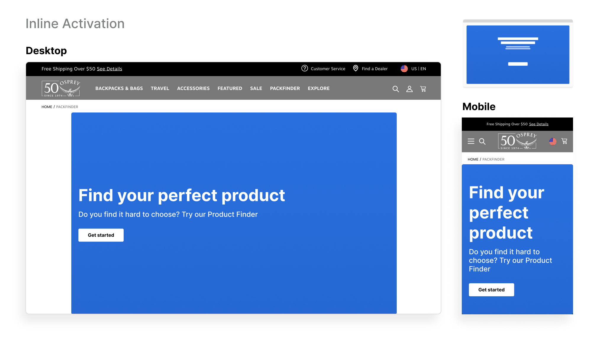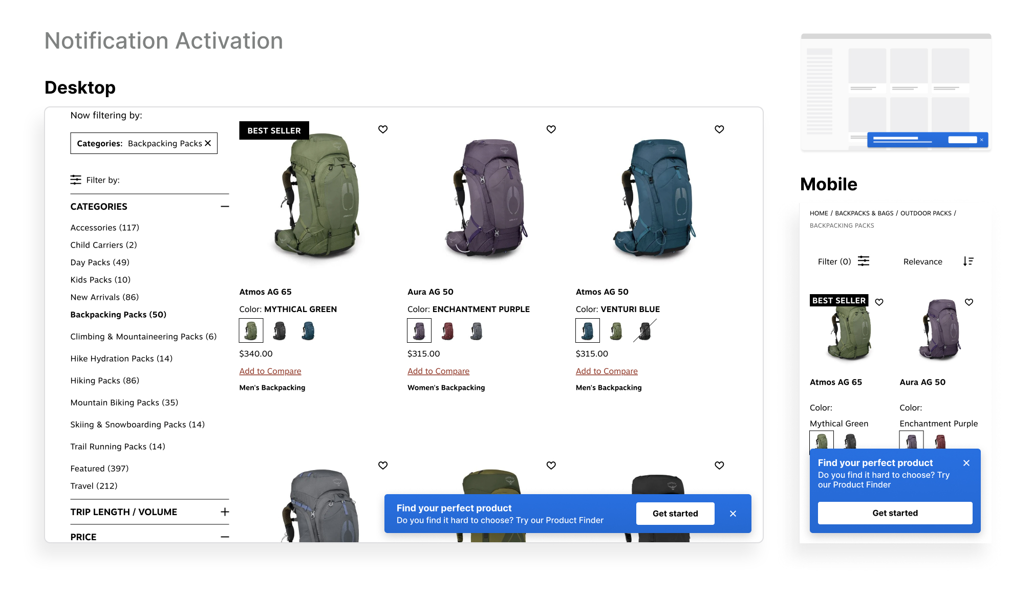 Highlight your advisor through a banner activation, in this example it targets users who may interact with the filtering menu. It allows you to remind users of the advisor where they are looking for a narrowed down selection of products. Contact your Account Manager for assistance in setting up this activation.